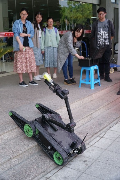 核化探测遥操作机器人,装有前倒臂履带和机械手,可以适应多种任务,许多同学都尝试操作机器人,有的同学还操作机器人完成了扔垃圾的任务。