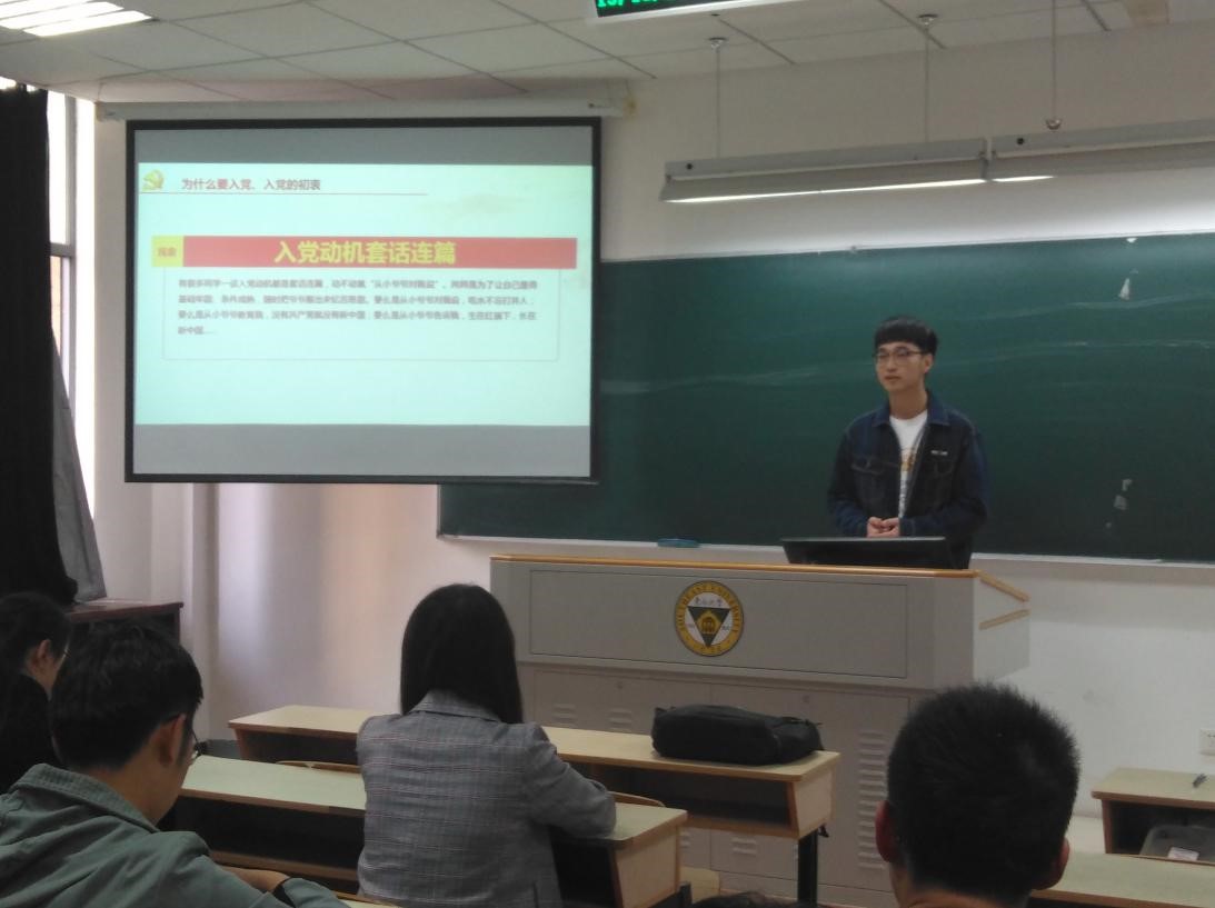 此外,他要求大家认真思考除了考公务员、选调生、进入国企、事业单位等优势,撇开爱国、爱党、爱人民等因素,实实在在地说,究竟为什么要入党?为了让大家能够有更深入的体会,他从吴孟超院士入党经历、南航马克思主义学院现任党委书记徐川自述入党经历、“最美女教师”张丽莉的入党故事这三个事例出发,讲述了优秀榜样入党的初衷。并播放了《人民的名义》中陈岩石老同志给省委领导讲党课的视频和电影《烈火英雄》组建敢死队时说“是党员的义不容辞”这一台词的片段,从而要求各位党员要牢固树立党员意识和身份认同感,坚守底线,守住品格,在浮躁的社会环境中给党性、原则、信仰留出一个位置。
