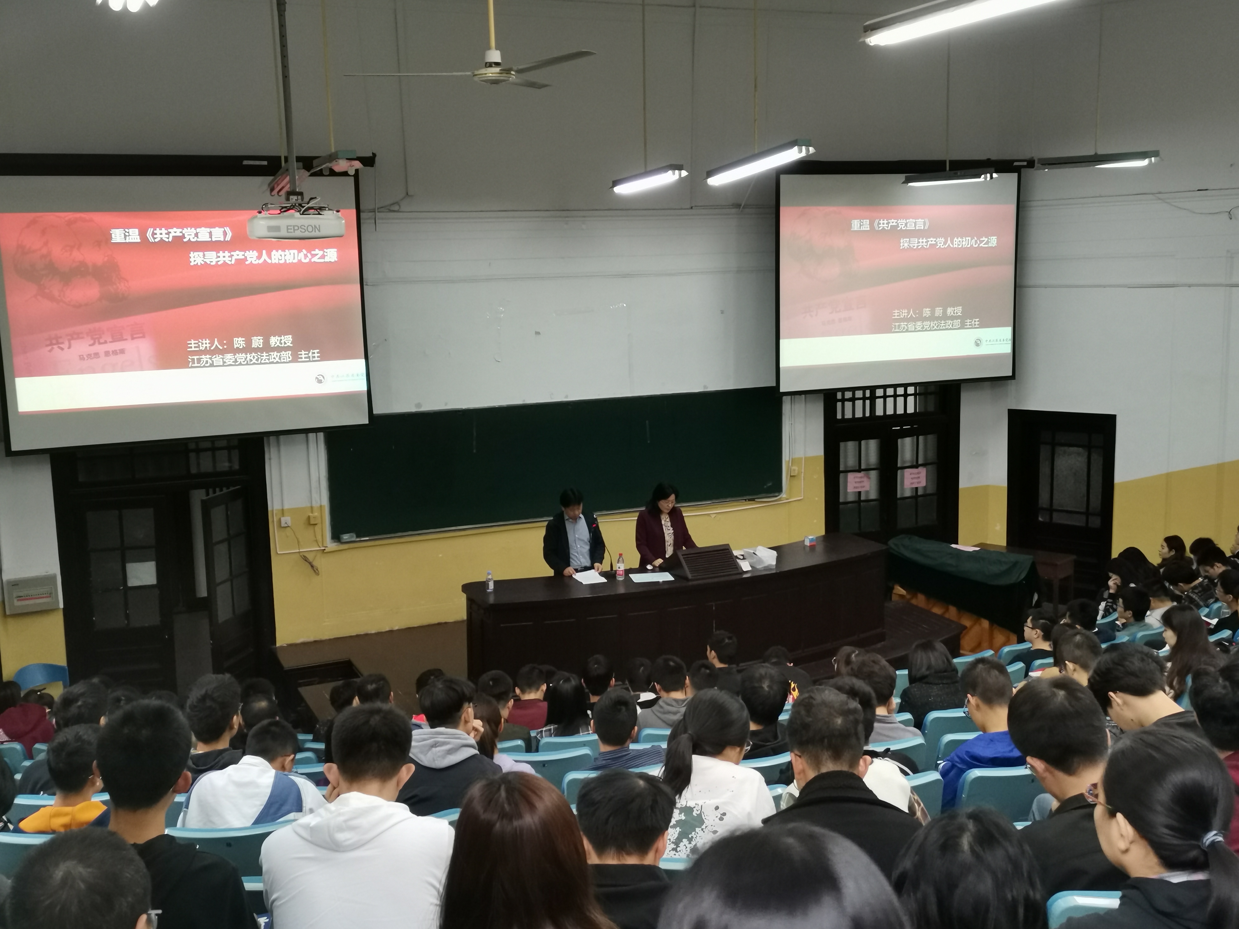 同时,作为“不忘初心 牢记使命”主题教育理论学习的一部分,学院领导班子成员、师生党支部书记及支委也到场聆听了江苏省委党校陈蔚教授题为“重温共产党宣言,探寻共产党人的初心之源”的讲座。在近三个小时的报告中,陈蔚教授围绕《共产党宣言》诞生的时代背景、马克思和恩格斯的共产主义信仰形成之路、《共产党宣言》的主要内容以及今天如何通过重温《共产党宣言》坚定共产主义信仰等方面,对共产党人的初心和使命作了深入浅出的阐述,帮助大家进一步理解和坚定了共产主义的崇高信仰。