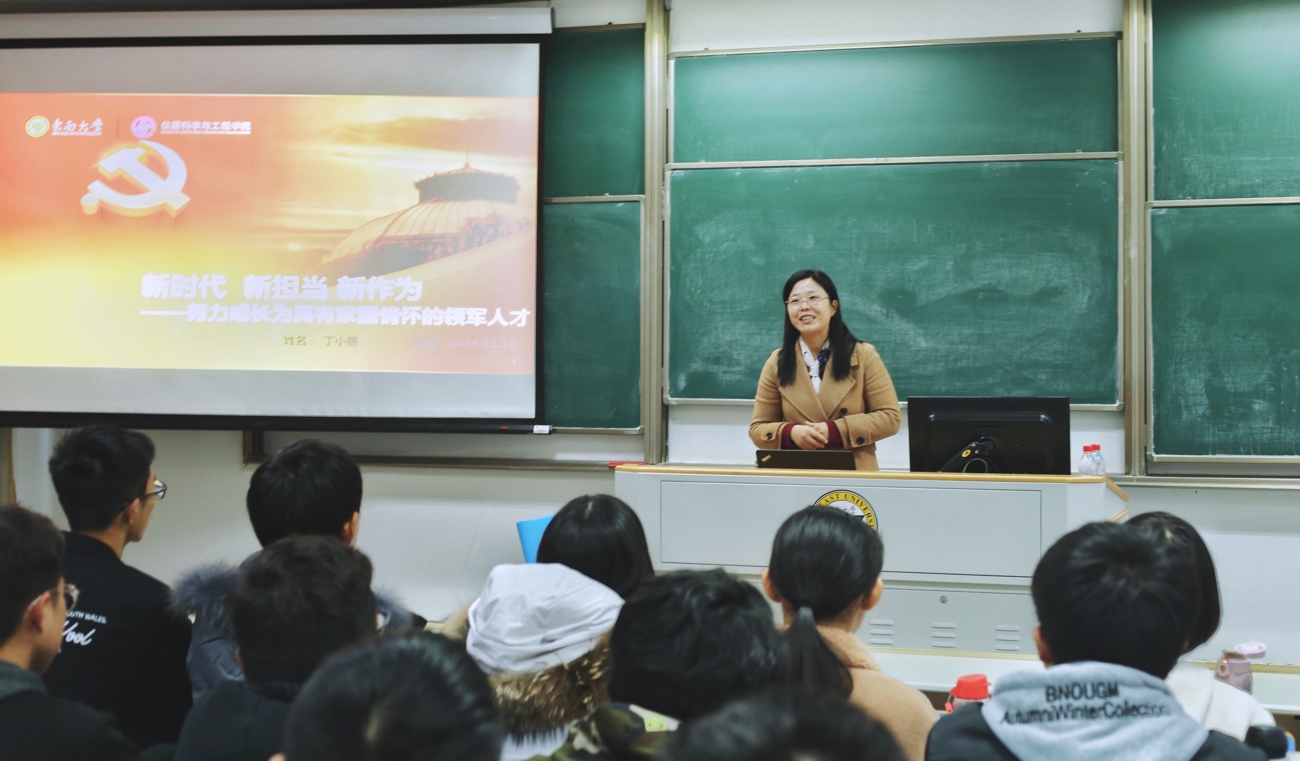 11月20日,公司党委副书记兼副经理丁小丽老师为G23194班同学讲授了主题为“新时代、新担当、新作为——努力成长为具有家国情怀的领军人才”的主题教育党课。她从习总书记论青年工作出发,鼓励同学们要勇于担当新时代中国青年的责任,做好学习工作规划,努力成长为具有家国情怀和国际视野,能够引领未来和造福人类的领军人才。