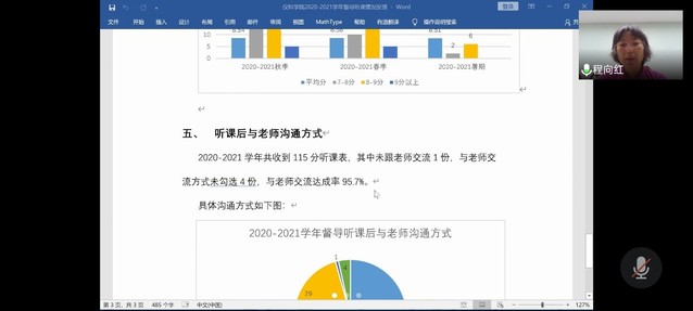 程向红老师首先从督导听课达成率、课程覆盖率、授课老师覆盖率、听课成绩分布以及与老师交流状况等几个方面,通报了2020-2021学年督导组听课情况。