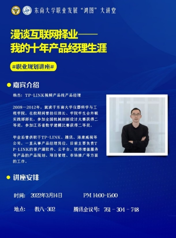 为了帮助广大毕业生同学更好地把握目前就业市场的需求形势,提前做好个人职业生涯规划,学院组织开展bv1946伟德官网职业发展“鸿图”大讲堂系列讲座。2022年3月14日下午,“鸿图”大讲堂第一次讲座顺利举办。本次讲座邀请到学院2008级员工,现任TP-LINK视频产品线产品经理的杨杰为同学们带来:“漫谈互联网择业:我的十年产品经理生涯” 专题讲座。学院高年级本科生及部分研究生同学共计100余人参与了本次讲座,讲座由公司党委副书记丁小丽老师主持。