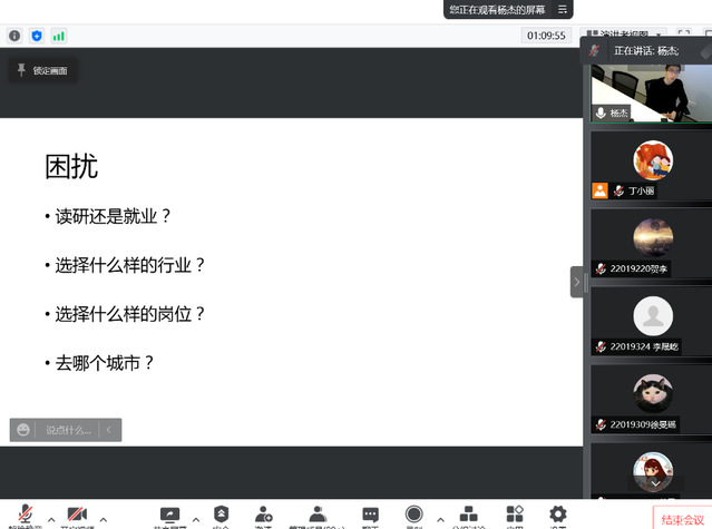 最后,针对同学们最关心的的问题:“读研还是就业”以及就业规划的困扰,杨杰建议同学们结合自己的个人情况和社会、市场发展趋势,不要盲目跟风,并鼓励同学们用发展的眼光看职业生涯规划,抓住时代的红利和无限的可能性,做出适合自己的选择。