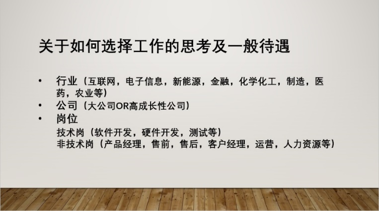 讲座第一部分由杨晨煜分享他的本科求职经验。杨晨煜从选择就业的原因、相关行业薪资待遇、就业信息及就业准备三个方面进行分享。他首先提醒同学们不要盲目跟风,一定要结合自身情况选择发展方向。杨晨煜着重分享了关于求职的思考以及不同公司、岗位的薪资待遇对比,并建议同学们入职大公司,若想进入成长性的小公司需要有发展性的眼光。此外,他提到本科生求职时对于技术岗竞争力较低,多数入职非技术岗。