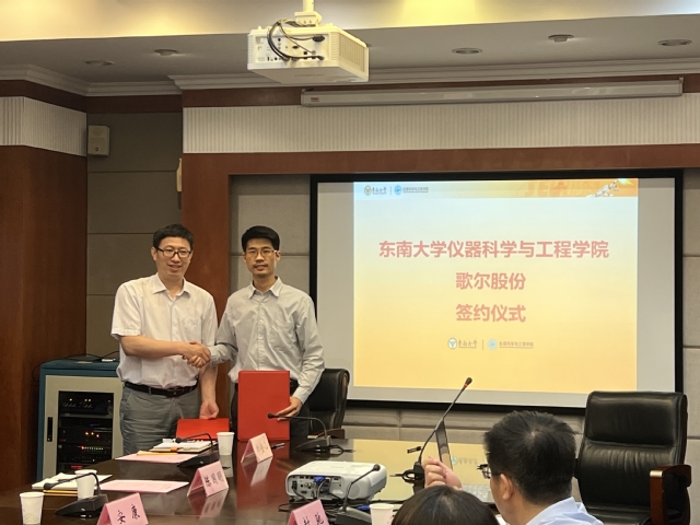 2022年5 月 23日,公司与歌尔股份有限公司合作签约仪式在四牌楼校区榴园宾馆举行。歌尔股份有限公司中央研究院经理张金国、副经理于洋、穿戴产品线技术委员会主任潘俊杰、学院副经理(主持工作)刘澄玉、副经理潘树国,校技术转移中心吴易飞等出席了仪式。仪式由公司党委书记王军书记主持。
