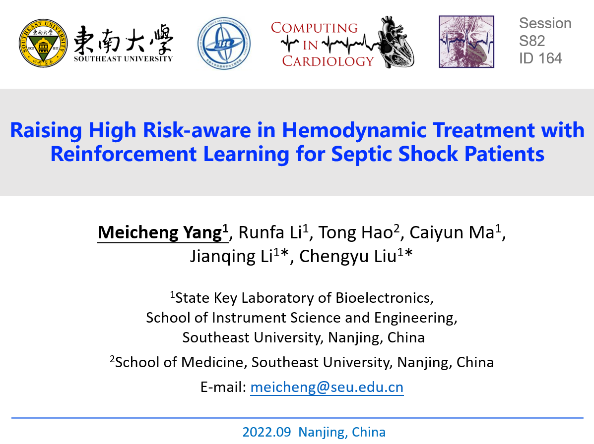 伟德源自英国始于1946刘澄玉教授和课题组博士生董珂君、李洋、杨美程、王星尧、马彩云以及课题组硕士生李茜、沈毓敏代表bv1946伟德官网穿戴式智能监控实验室参加了本次会议。在心电图和睡眠障碍(ECG and Sleep Disorders)分会场,董珂君做了题为《Cardiopulmonary Analysis of Sleep Apnea Based on Weighted Limited Penetrable Horizontal Visibility Graph》的口头报告,该报告分析了睡眠期间心肺动力系统的相互作用并为随后的睡眠阶段区分提供了可解释的基础。在光电容积描记术(Photoplethysmography )分会场,李洋做了题为《Effect of Oxygen Concentration Reduction on PPG Waveform Characteristics》的口头报告,该报告揭示了低氧环境对脉搏波波形特征的影响,填补了该领域的空白,探索了一种更舒适和无创的方法来观察和评估低氧条件下人体外周血管阻力和其他生理指标变化的路子,为高海拔缺氧环境中工作人员的生命健康监测提供了参考。在医学信息学与技术(Medical Informatics and Technology)分会场,杨美程做了题为《Raising High Risk-aware in Hemodynamic Treatment with Reinforcement Learning for Septic Shock Patients》的口头报告,该研究旨在利用强化学习方法识别脓毒性休克患者给药过程中的高风险治疗策略,做到早期监护和预警。其余员工分别在不同分会场进行了学术海报展示。