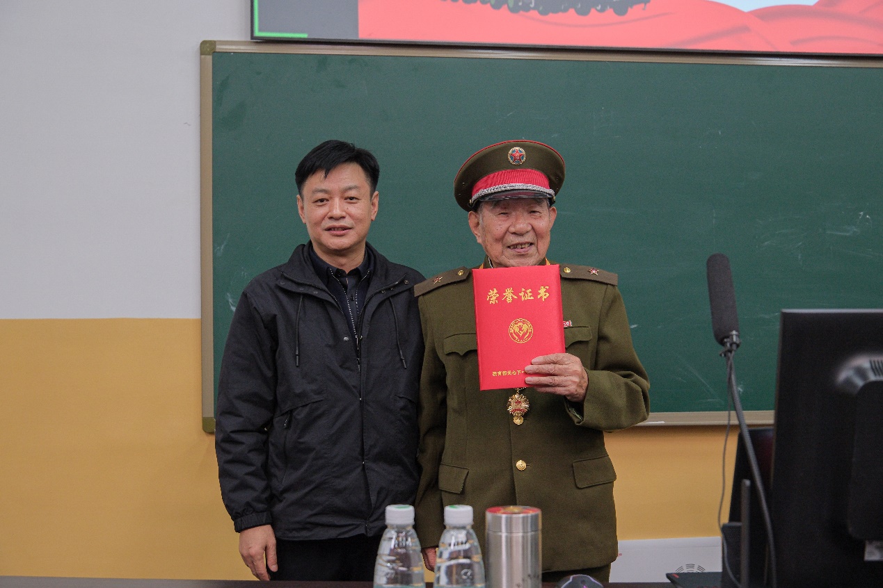 讲座开始前,bv1946伟德官网党委副书记邢纪红致辞,对董老师三十五年来如一日投身国防教育表达了深深的敬佩与感谢,并为董老师颁发了2021年全国教育系统关心下一代工作“突出贡献奖”的奖牌与证书。董本植老师用“感谢、激动、感激”六个字表达了自己激动的心情,并表示是成千上万的员工和老师给予他力量,共同获得了此次荣誉。