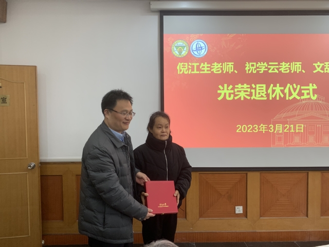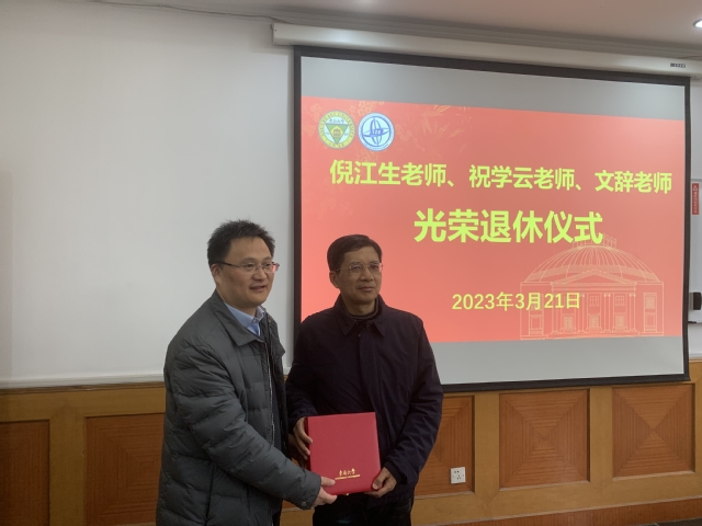 会上,还为2022年退休的祝学云、文辞、倪江生三位老师举行了简单的荣休仪式。