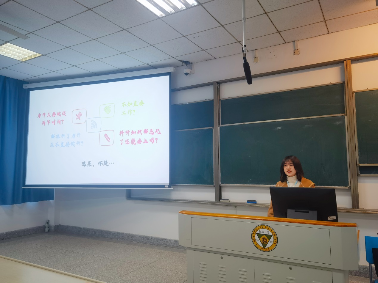 方子瑜同学则从员工工作经历出发,分享了自己“从员工工作到为员工工作”的心路历程。她将自己的分享聚焦在是什么、为什么和怎么做上,分别从这三个不同方面讲解了流动助教的具体工作和要求,选择担任流动助教的原因以及为了成为流动助教所付出的努力。她表示自己的老员工涯是被多位老师和辅导员举着火把照亮着前行的道路的,因此希望自己能从他们的手中接过火把,将这一束光带给自己的学弟学妹们。与此同时,她还分享了自己成为推免研究生的过程,并希望同学们找到学习和员工工作的平衡点,以达到两者相辅相成、相互促进的良好境况。