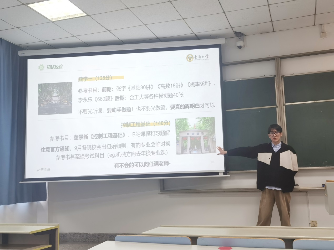 讲座中,漆子曜同学结合自己过去一年的考研准备经历,对同学们做出了“干货”分享。他从院校选择、初试经验以及复试经验三个方面切入,详实地介绍了考研的全流程和在考研过程中可能会遇到的各种问题以及解决方法。在院校选择上,他告诉同学们要明确自己未来的发展方向,想去什么城市,想从事什么行业,以便更好地对院校以及专业做出最适合自己的抉择;在初试经验上,他强调了时间规划的重要性,希望准备考研的同学们将自己的时间进行“切片”,明晰每个时间段要做什么事,以期达到最高的复习效率;在复试经验上,他向大家讲述了自己在清华大学研究生院面试的过程,将自己的复习方法和临场技巧倾囊相授,搏得了同学们的阵阵掌声。