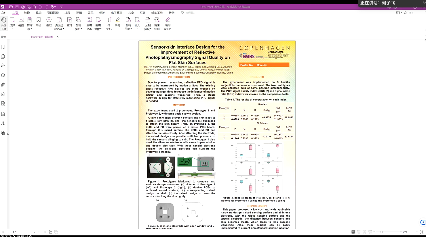 Zifei He introduced a poster, “Sensor-skin Interface Design for the Improvement of Reflective Photoplethysmography Signal Quality on Flat Skin Surfaces”. This work presented low-cost design considerations that improves the raw signal quality of reflective PPG. Major considerations were raised sensing surface and all-in-one electrode. The results show that the proposed device outperforms the conventional device at PPG signal.