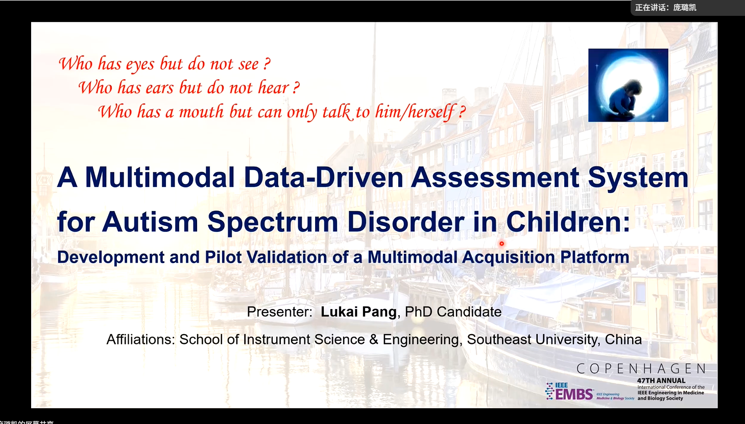 Lukai Pang delivered a presentation entitled “A Multimodal Data-Driven Assessment System for Autism Spectrum Disorder in Children” at the 47th IEEE EMBC in Copenhagen. She introduced a mobile platform integrating EEG, ECG, speech, facial expressions, and clinical scales for objective ASD assessment in children, and discussed future extension to younger age groups. She also exchanged views with experts on its potential as a low-cost, data-driven early screening paradigm.