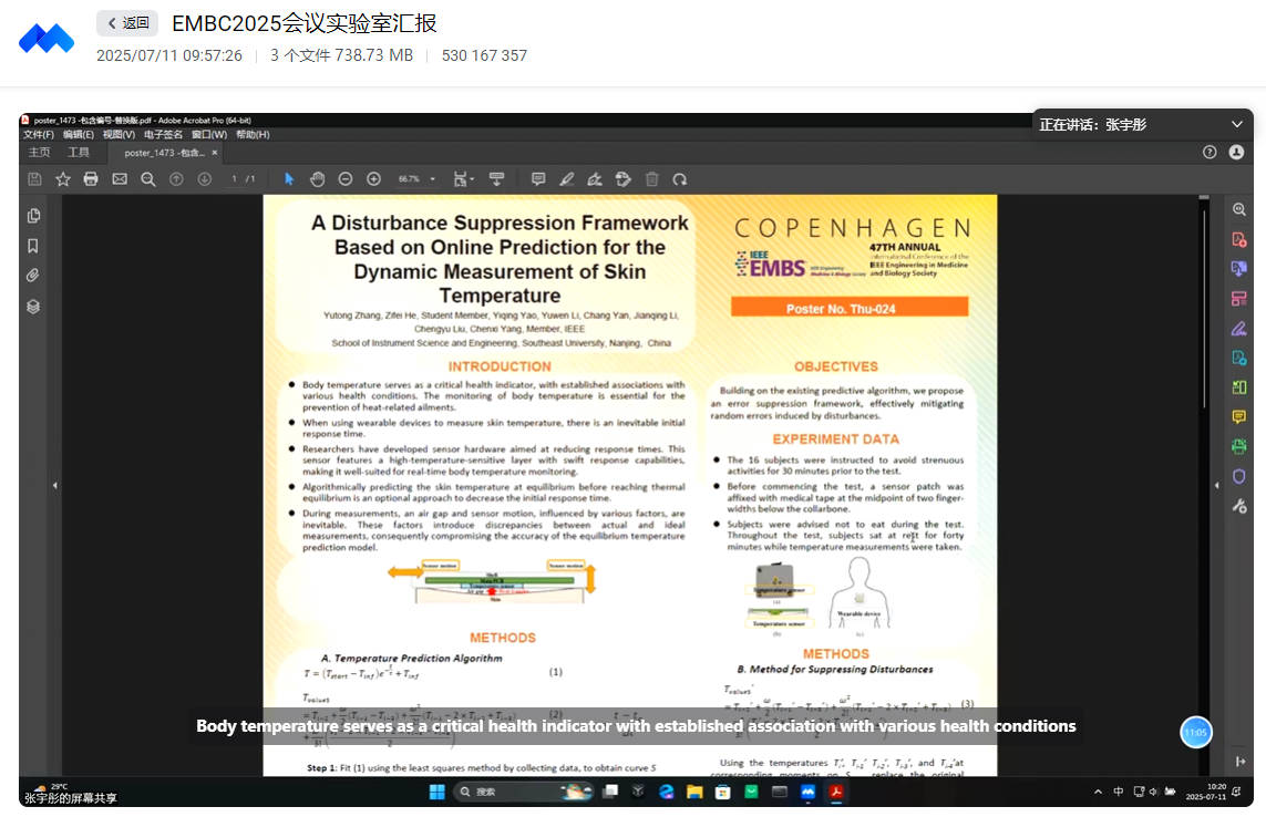 Yutong Zhang presented "A Disturbance Suppression Framework Based on Online Prediction for the Dynamic Measurement of Skin Temperature," introducing a framework that refines parametric methods in heat conduction analysis. Subsequently, she engaged in discussions with Professors Yang and Xing.