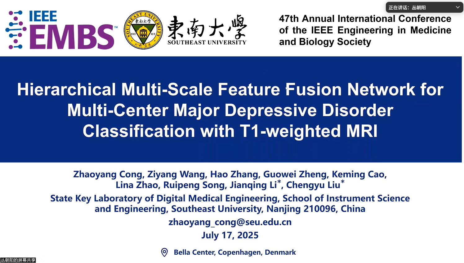 From July 14 to 17, 2025, a six-member graduate team from the Institute of Advanced Medical Engineering and Equipment, School of Instrument Science and Engineering, Southeast University, will attend the 47th IEEE International Conference on Engineering in Medicine and Biology (EMBC 2025) at the Bella Center, Copenhagen. Founded in 1957, EMBC is one of the most influential conferences in biomedical engineering. The 2025 edition, co-hosted by the Technical University of Denmark and the University of Copenhagen, focuses on “Engineering Medicine, Innovating Healthcare” and has attracted more than 2,300 participants worldwide. Ahead of the trip, the SEU team held an online rehearsal within the school to refine their presentations and exchange feedback with faculty and peers.